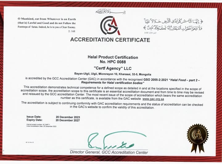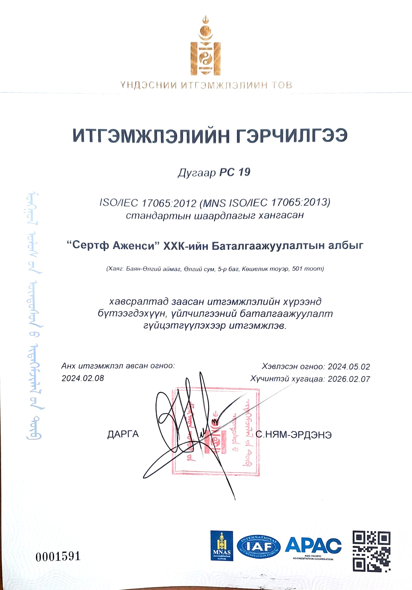БҮТЭЭГДЭХҮҮН, ҮЙЛЧИЛГЭЭГ БАТАЛГААЖУУЛАЛТАНД ХАМРУУЛЖ ТОХИРЛЫН ГЭРЧИЛГЭЭ АВАХ ТУХАЙ ӨРГӨДЛИЙН МАЯГТ Маягтыг info@certf-agency.com хаяг руу илгээнэ үү. БҮТЭЭГДЭХҮҮН, ҮЙЛЧИЛГЭЭГ БАТАЛГААЖУУЛАЛТАНД ХАМРУУЛАХ ХҮСЭЛТИЙН ЗАГВАР БҮТЭЭГДЭХҮҮН, ҮЙЛЧИЛГЭЭГ БАТАЛГААЖУУЛАЛТАНД ХАМРУУЛЖ ТОХИРЛЫН ГЭРЧИЛГЭЭ СУНГУУЛАХ ТУХАЙ ӨРГӨДЛИЙН МАЯГТ МЕНЕЖМЕНТИЙН ТОГТОЛЦООНД БАТАЛГААЖУУЛАЛТ ХИЙЛГҮҮЛЭХ ТУХАЙ ӨРГӨДЛИЙН МАЯГТ БАТАЛГААЖУУЛАЛТЫН АЖИЛ, ҮЙЛЧИЛГЭЭНИЙ ТӨЛБӨРИЙН ХЭМЖЭЭ БАТАЛГААЖУУЛАЛТЫН ГЭРЧИЛГЭЭ, ТЭМДГИЙГ ХЭРЭГЛЭХ ЗААВАР БҮТЭЦ ЗОХИОН БАЙГУУЛАЛТ Итгэмжлэлийн гэрчилгээСертф аженси ХХК нь Монголын Үндэсний Итгэмжлэлийн төвөөс итгэмжлэгдсэн /PC-19/ Хамрах хүрээ Хүнсний бэлэн бүтээгдэхүүн,Мал, амьтны гаралтай хүнсний бүтээгдэхүүн, Ургамлын гаралтай бүтээгдэхүүн, Жимс, жимсээр хийсэн бүтээгдэхүүн, Мах, махан бүтээгдэхүүн, Хэрэглэгчдэд зориулсан үйлчилгээ(Хүнсний дэлгүүр, зоогийн газар, зочид буудал, дэн буудал, үс засах газар, гоёлын гоо заслын газар, катеринг) Итгэмжлэлийн гэрчилгээСертф аженси ХХК нь Персийн булангийн орнуудын Итгэмжлэлийн төвөөс итгэмжлэгдсэн /HPC-0088/ Хамрах хүрээ – Catering E Preparation, storage and, where appropriate, delivery of food for consumption, at the place of preparation or at a satellite unit Хамтын ажиллагааСертф аженси ХХК нь ARS Assessment компанийн Монгол дахь албан ёсны онцгой төлөөлөгчөөр ажилладаг. Хамрах хүрээ ARS Assessment компани нь олон улсын стандартын баталгаажуулалт, тохирлын үнэлгээ, сургалтын чиглэлээр үйл ажиллагаа явуулдаг, UAF (United Accreditation Foundation)-ийн итгэмжлэлтэй байгууллага юм. Бид ISO 9001, ISO 14001, ISO 45001, ISO 22000, ISO 27001, ISO 21001 зэрэг олон улсын стандартын хүрээнд баталгаажуулалтын үйлчилгээ үзүүлдэг.